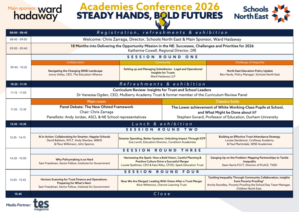 This session will take a broad lens across the Government’s priorities and look at how academy trusts across the NE can play their part.