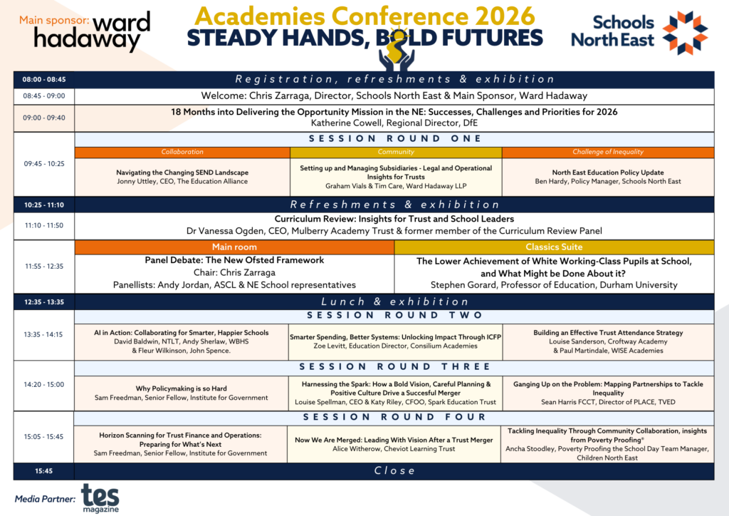 Each year, the Academies Conference brings together more than 200 senior leaders from academies, multi-academy trusts and maintained schools across the North East and beyond. The event provides a unique opportunity to connect and collaborate, while exploring the shared challenges and opportunities within the sector.