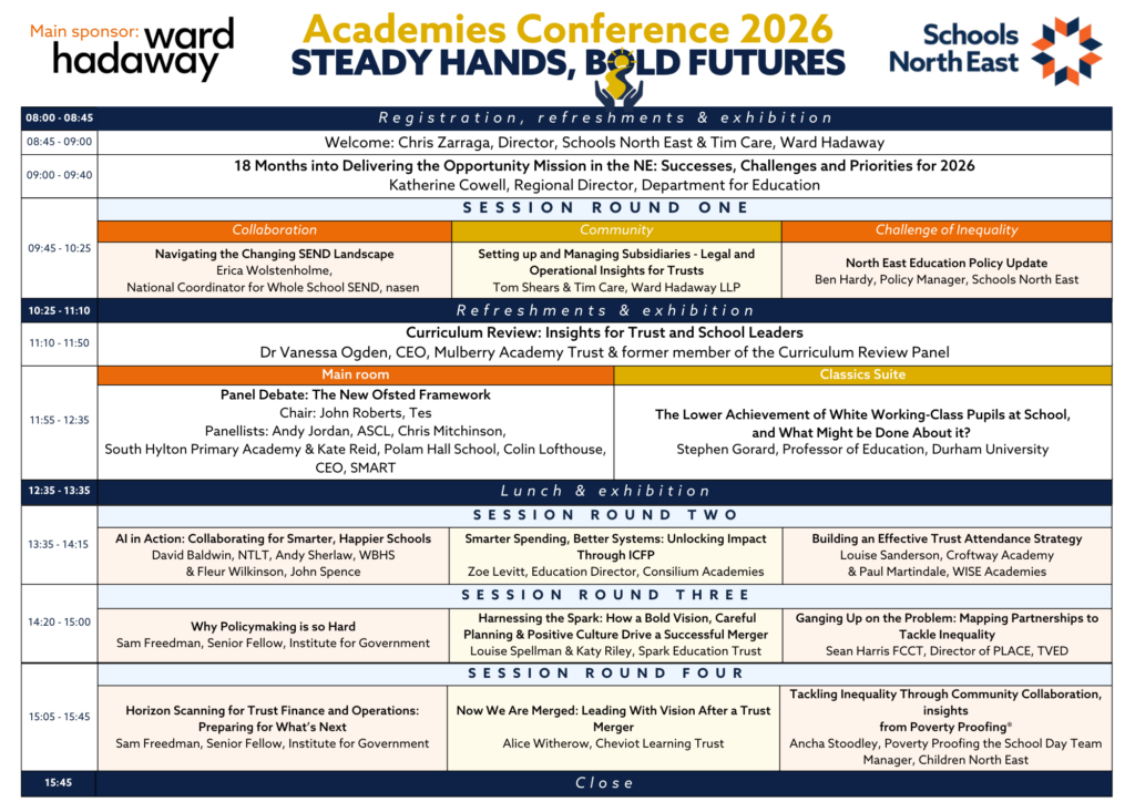 This session will take a broad lens across the Government’s priorities and look at how academy trusts across the NE can play their part.